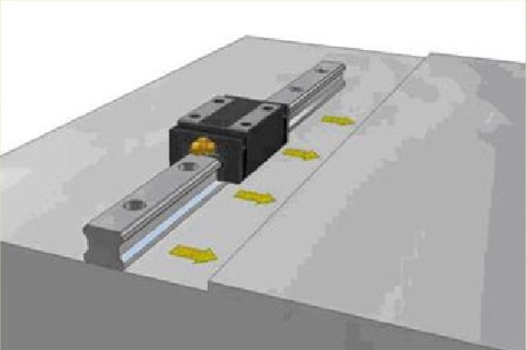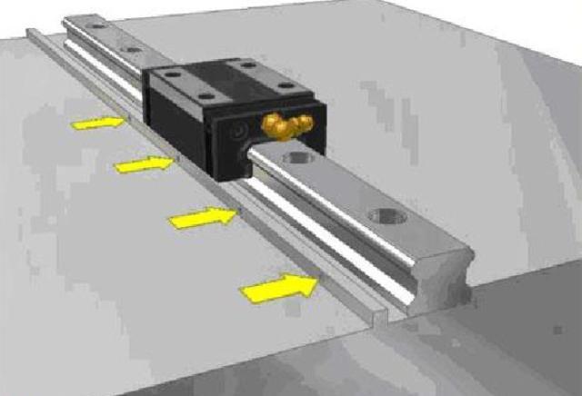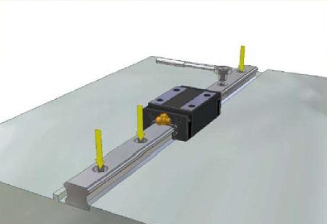 (2)将主轨轻轻安置在床台上,使用侧向固定螺丝或其他固定治具使线轨与侧向安装面轻轻贴合。安装使用前要确认螺丝孔是否吻合,假设底座加工孔不吻合又强行锁紧螺栓,会大大影响到组合精度与使用品质。