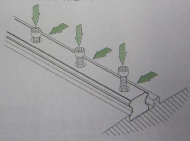 (3)由远端向近端按顺序将滑轨的定位螺丝稍微旋紧,使轨道与垂直安装面稍微贴合。垂直基准面稍微旋紧后,加强侧向基准面的锁紧力,使主轨可以确实贴合侧向基准面。