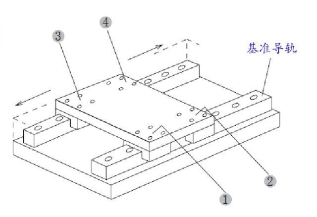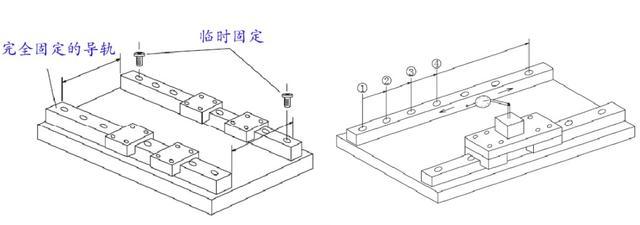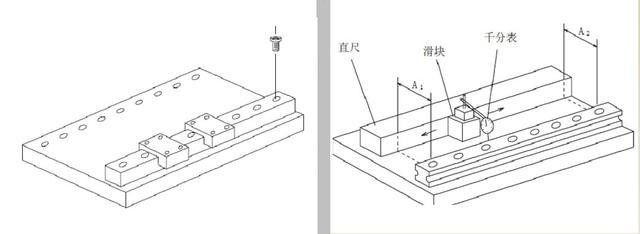 (3)刚才被完全固定的导轨此时可以当做基准轨使用了,在从动导轨的两端各暂时拧上一个螺钉。然后在基准轨的两个滑块上放置千分表,移动千分表边读数边把调整轨的螺栓从一端向另一端依次锁紧。