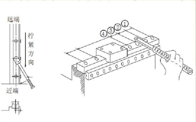(2)由远端向近端依次锁紧螺钉,螺钉锁紧扭矩参照上例中的扭矩表数值。所有的螺栓拧紧后用千分表从导轨一段滑到另一端确保平行度。当无侧向定位装配面时,如果螺钉从导轨中部开始安装,由于安装螺栓和安装孔之间存在的摩擦,很容易造成导轨的微小S变形,建议由远端向近端依次锁紧螺钉。