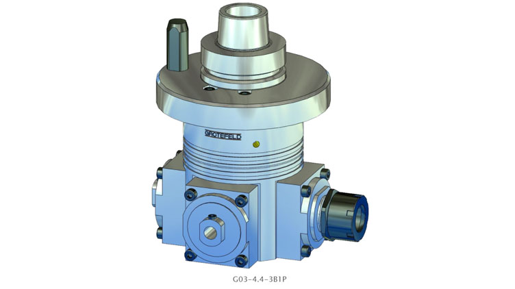 G03 系列的角头具有多达四个加工主轴。所有刀架的主轴旋转方向始终与驱动器的旋转方向相同。驱动速度以 1:1.55 的比例传递到刀架。间歇运行时主轴最高转速可达 18,000 rpm。
