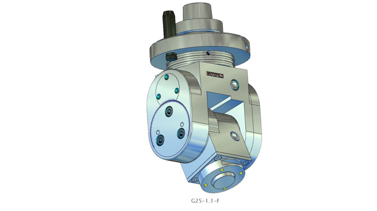 G25系列的角头具有可根据刻度进行无级调整的加工主轴。设置范围从 0°(垂直)扩展到两侧最大 100°。主轴的旋转方向与驱动器的旋转方向相反。