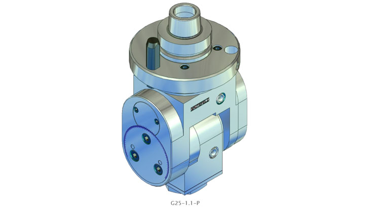 G25系列的角头具有可根据刻度进行无级调整的加工主轴。设置范围从 0°(垂直)扩展到两侧最大 100°。主轴的旋转方向与驱动器的旋转方向相反。