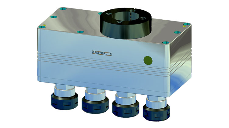 带有夹紧环 B100 的 VS16 齿轮箱也可以由钻孔主轴 B045 和驱动单元 D045 驱动。此外,使用我们的驱动适配器 DN 和 DMN 可以适应机床主轴以及 GROTEFELD 旋转单元 DVM。