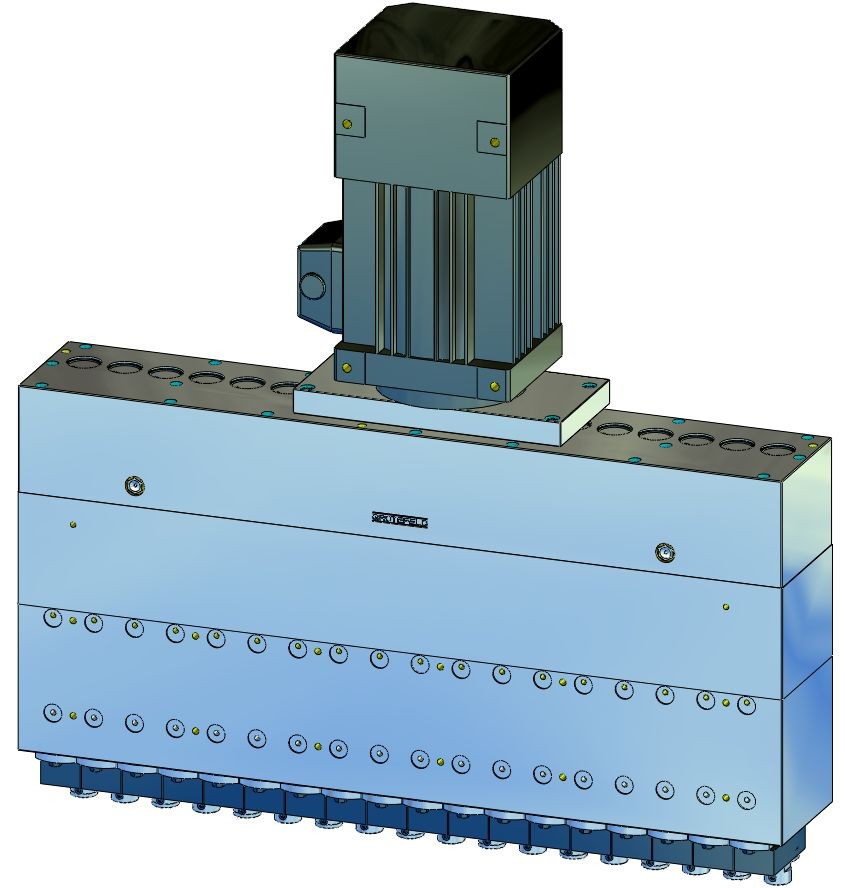 DBE04 系列的单排可控钻孔主轴单元可以补充电磁阀。电磁阀安装在相应气缸背面的板上。这些板通过空气管道相互连接。这样做的优点是主供气只需供应一次。