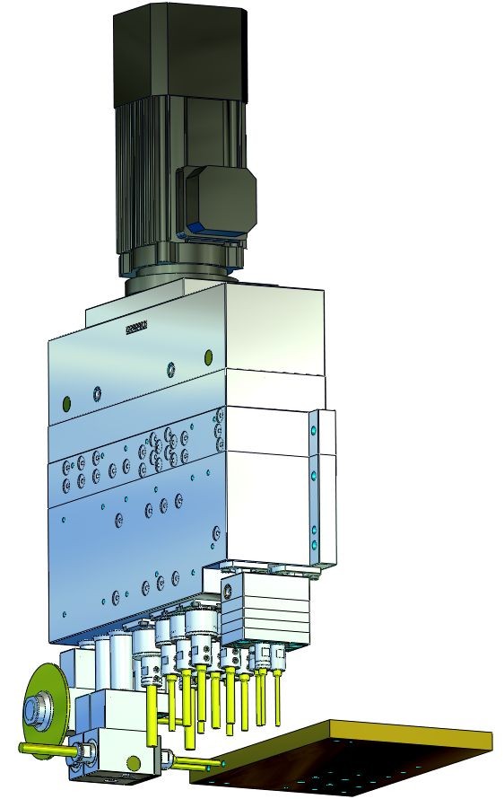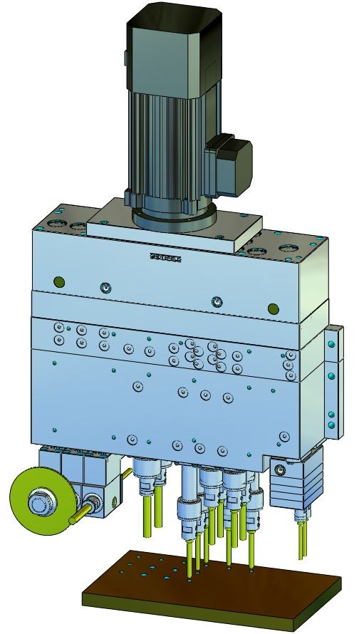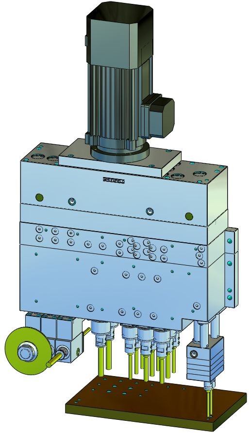 立式钻孔主轴可与钻孔距离≥16mm的卧式钻孔主轴和立式钻孔齿轮组合。单独的钻孔主轴可自由选择,长度为 50 毫米,可根据要求提供更长行程的单元。实际钻孔进给必须由客户的机器进给执行。这些装置是轮驱动的,最高速度为 8,600 rpm。