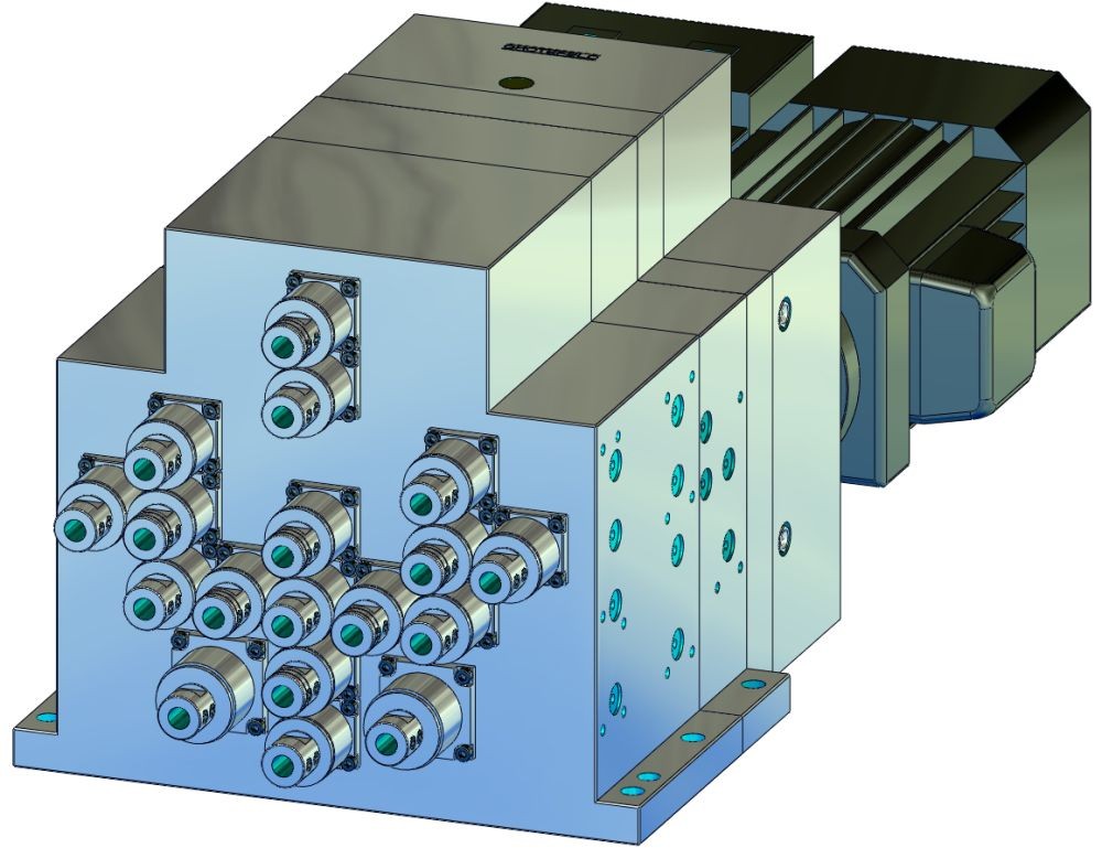 DBE24 系列的钻孔主轴单元特别适用于 2 排以上的钻孔图案。但是,齿轮箱也可以设计为 R、L、T 设计,这会导致设计非常狭窄。