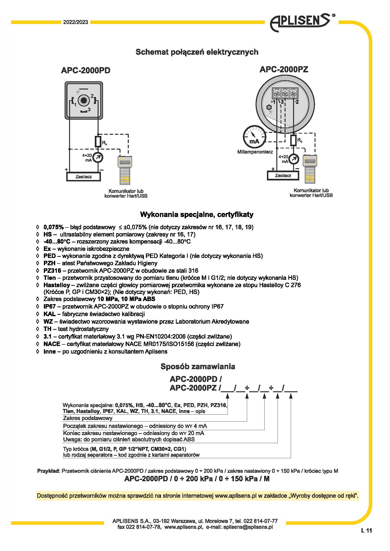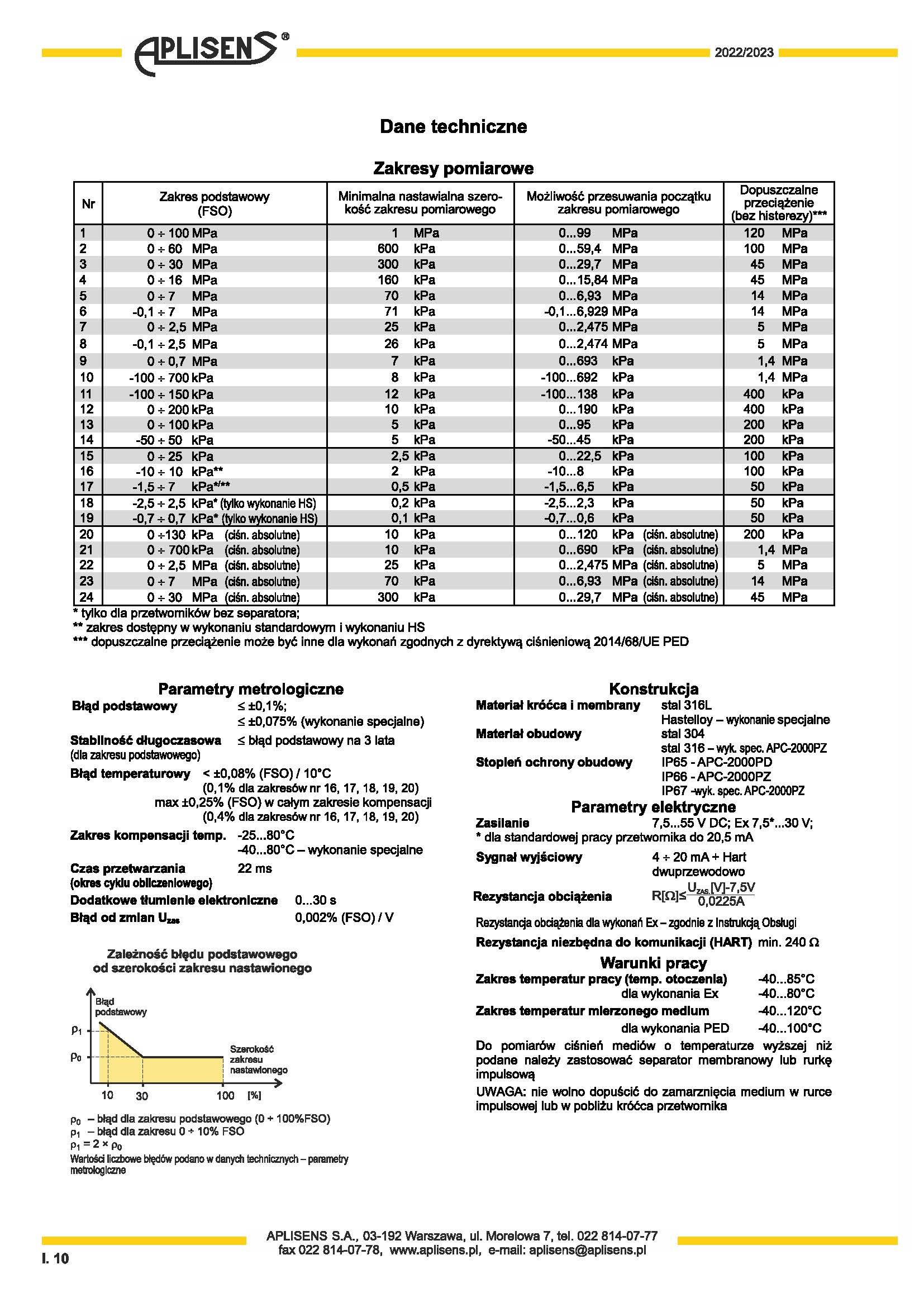 4 ÷ 20 mA输出信号+ Hart 协议。证书和认证:ATEX、PZH基本误差0.1%外壳由耐酸钢制成外壳防护等级为IP-65、IP-66或IP-67
