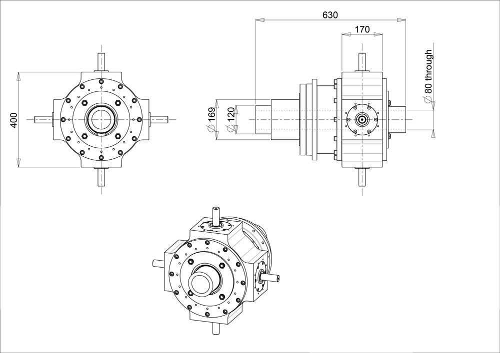 下面的视频显示了具有 3 个输出的球锥分度器:两个输出旋转 90 度,第三个输出旋转 180 度。